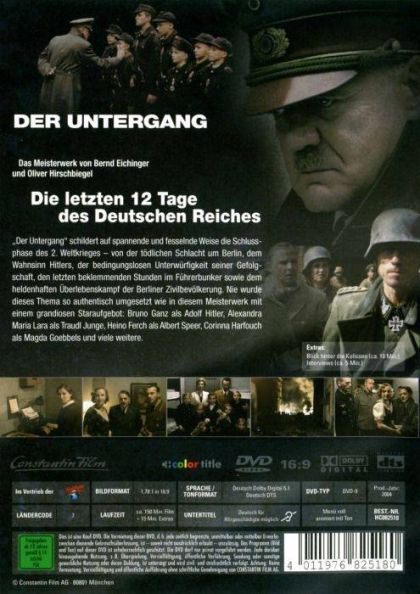 "Der Untergang" schildert auf spannende und fesselnde Weise die Schlussphase des 2. Weltkrieges - von der tödlichen Schlacht um Berlin, dem Wahnsinn Hitlers, der bedingungslosen Unterwürfigkeit seiner Gefolgschaft, den letzten beklemmenden Stunden im Führerbunker sowie dem heldenhaften Überlebenskampf der Berliner Zivilbevölkerung. Nie wurde dieses Thema so authentisch umgesetzt wie in diesem Meisterwerk mit einem grandiosen Staraufgebot: Bruno Ganz als Adolf Hitler, Alexandra Maria Lara als Traudl Junge, Heino Ferch als Albert Speer, Corinna Harfouch als Magda Goebbels und viele weitere.