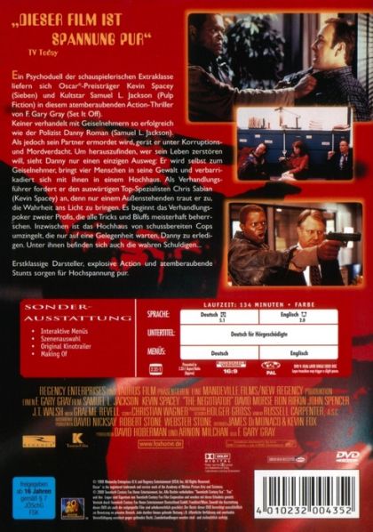 Ein Psychoduell der schauspielerischen Extraklasse liefern sich Oscar- Preisträger Kevin Spacey (Sieben) und Kultstar Samuel L. Jackson (Pulp Fiction) in diesem atemberaubenden Action-Thriller von F.Gary Gray (Set It Off).Keiner verhandelt mit Geiselnehmern so erfolgreich wie der Polizist Danny Roman (Samuel L. Jackson). Als jedoch sein Partner ermordet wird, gerät er unter Korruptions- und Mordverdacht. Um herauszufinden, wer sein Leben zerstören will, sieht Danny nur einen einzigen Ausweg: Er wird selbst zum Geiselnehmer, bringt vier Menschen in seine Gewalt und verbarrikadiert sich mit ihnen in einem Hochhaus. Als Verhandlungsführer fordert er den auswärtigen Top- Spezialisten Chris Sabian (Kevin Spacey) an, denn nur einem Außenstehenden traut er zu, die Wahrheit ans Licht zu bringen. Es beginnt das Verhandlungspoker zweier Profis, die alle Tricks und Bluffs meisterhaft beherrschen. Inzwischen ist das Hochhaus von schussbereiten Cops umzingelt, die nur auf eine Gelegenheit warten, Danny zu erledigen. Unter ihnen befinden sich auch die wahren Schuldigen...Erstklassige Darsteller, explosive Action und atemberaubende Stunts sorgen für Hochspannung pur.