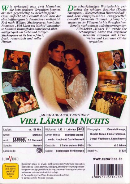 Wie verkuppelt man zwei Menschen, die kein größeres Vergnügen kennen, als sich gegenseitig zu beschimpfen?Ganz einfach! Man erzählt ihnen, dass der eine hoffnungslos in den anderen verliebt ist. Frei nach William Shakespears komischer Romanze "Viel Lärm um Nichts" inszenierte Kenneth Branagh das hinreissend-übermütige Spiel um Liebe und Intrigen. Shakespeare at its best - frisch, frech, romantisch und voller Humor.Die scharfzüngigen Wortgefechte zwischen der schönen Beatrice (Emma Thompson: "Wiedersehen in Howards End") und dem eingefleischten Junggesellen Benedikt (Kenneth Branagh: "Henry V.") suchen in der Filmgeschichte ihresgleichen. Bereits nach seinem aufsehenerregenden Filmdebüt "Henry V." wurde der Schauspieler, Autor und Regisseur Kenneth Branagh mit Orson Welles und Laurence Oliver verglichen.