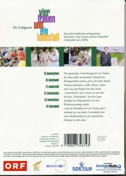 Die dritte Staffel der erfolgreichen Krimiserie "Vier Frauen und ein Todesfall" - 6 Episoden auf 2 DVDsDei eigensinnige Verbrecherjagd der vier Damen, die hinter jedem unerwarteten Todesfall eine Mordsgeschichte wittern, geht in die dritte Runde. Diesmal bekommen es Julie, Maria, Sabine und Lola zum Beispiel mit dem letalen "Fensterlsturz" eines Voyeurs zu tun oder mit dem "Totalschaden", den der Gegenkandidat des Bürgermeisters bei einer Wahlveranstaltung erleidet.Auch im Privatleben der vier Damen geht es turbulent zu: von fatalen Liebschaften über einen Mordanschlag bis zur romantischen Hochzeit ist alles dabei.