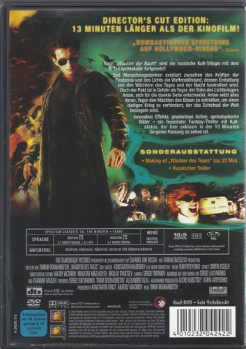 Nach "Wächter der Nacht" wird die russische Kult-Trilogie mit dem 2. Teil spektakulär fortgesetzt!Seit Menschengedenken existiert zwischen den Kräften der Finsternis und des Lichts ein Waffenstillstand, dessen Einhaltung von den Wächtern des Tages und der Nacht kontrolliert wird. Doch der Pakt ist in Gefahr als Yegor, der Sohn des Lichtkriegers Anton, sich für die dunkle Seite entscheidet. Anton setzt alles daran, Yegor den Mächten des Bösen zu entreißen, um einen blutigen Krieg zu verhindern, der das Schicksal der Welt besiegeln wird.Innovative Effekte, gnadenlose Action, apokalyptische Bilder - ein fesselnder Fantasy-Thriller mit Kultstatus, der hier exklusiv in der 13 Minuten längeren Fassung zu sehen ist.