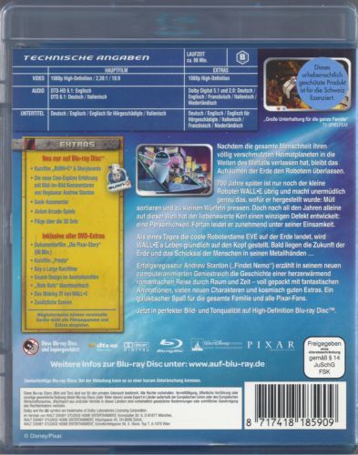 Nachdem die gesamte Menschheit ihren völlig verschmutzten Heimatplaneten in die Weiten des Weltalls verlassen hat, bleibt das Aufräumen der Erde den Robotern überlassen.700 Jahre später ist nur noch der kleine Roboter WALL•E übrig und macht unermüdlich genau das, wofür er hergestellt wurde: Müll sortieren und zu kleinen Würfeln pressen. Doch nach all den Jahren alleine auf dieser Welt hat der liebenswerte Kerl einen winzigen Defekt entwickelt: eine Persönlichkeit. Fortan leidet er zunehmend unter seiner Einsamkeit.Als eines Tages die coole Roboterdame EVE auf der Erde landet, wird WALL•E's Leben gründlich auf den Kopf gestellt. Bald liegen die Zukunft der Erde und das Schicksal der Menschen in seinen Metallhänden ...Erfolgsregisseur Andrew Stanton ("Findet Nemo") erzählt in seinem neuen computeranimierten Geniestreich die Geschichte einer herzerwärmend romantischen Reise durch Raum und Zeit - voll gepackt mit fantastischen Animationen, vielen neuen Charakteren und kosmisch guten Extras. Ein galaktischer Spaß für die gesamte Familie und alle Pixar-Fans.Jetzt in perfekter Bild- und Tonqualität auf High-Definition Blu-ray Disc™.