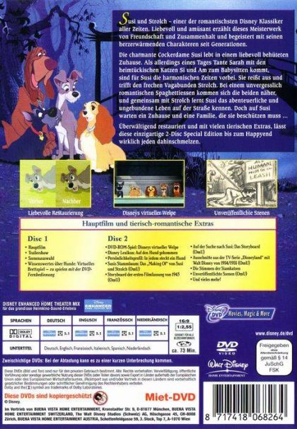 Susi und Strolch - einer der romantischsten Disney Klassiker aller Zeiten. Liebevoll und amüsant erzählt dieses Meisterwerk von Freundschaft und Zusammenhalt und begeistert mit seinen herzerwärmenden Charakteren seit Generationen.Die charmante Cockerdame Susi lebt in einem liebevoll behüteten Zuhause. Als allerdings eines Tages Tante Sarah mit den heimtückischen Katzen Si und Am zum Babysitten kommt, sind für Susi die harmonischen Zeiten vorbei. Sie reißt aus und trifft den frechen Vagabunden Strolch. Bei einem unvergesslich romantischen Spaghettiessen kommen sich die beiden näher, und gemeinsam mit Strolch lernt Susi das abenteuerliche und ungebundene Leben auf der Straße kennen. Doch auf Susi warten ein Zuhause und eine Familie, die sie beschützen muss ...Überwältigend restauriert und mit vielen tierischen Extras, lässt diese einzigartige 2-Disc Special Edition bis zum Happyend wirklich jeden dahinschmelzen.
