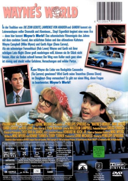 In der Tradition von DIE ZEHN GEBOTE, LAWRENCE VON ARABIEN und GHANDI kommt ein Leinwandepos voller Dramatik und Abenteuer... Stop! Eigentlich beginnt beginnt eine neue Ära – denn hier kommt Wayne’s World ! Das urkomischste Filmereignis des Jahres mit dem coolsten Sound, den schärfsten Babes und den ultimativen Kultstars Wayne Campbell (Mike Myers) und Garth Algar (Dana Carvey).Als ein schmieriger Fernsehfuzzi (Rob Lowe) Wayne und Garth mit ihrer schrägen Late-Night-Show groß rausbringen will, können sie ihr Glück nicht fassen. Aber sie finden schnell heraus: der Weg vom Keller nach ganz oben ist steinig und steckt voller Gefahren, Versuchungen und wilder Partys.Kann Wayne die Liebe von Rockgöttin Cassandra gewinnen? Wird Garth seine Traumfrau im Doughnut-Shop vernaschen? Es gibt nur einen Weg, diese Fragen zu beantworten: Wayne's World !