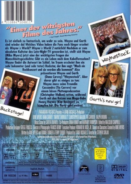 Es ist einfach zu fantastisch, um wahr zu sein. Wayne und Garth sind wieder da! Welches Video haben die Fans noch länger ersehnt als Wayne´s World? Wayne´s World 2 natürlich! Nachdem er zum absoluten Kultstar des Late-Night-TV geworden ist, stellt sich Wayne (Mike Myers) jetzt eine der wichtigsten Fragen der Menschheitsgeschichte: Gibt es ein Leben nach dem Kabelfernsehen? Wayne findet die Antwort im Schlaf. Im Traum erscheint ihm ein sehr bekannter (und sehr toter) Rockstar, der ihm sagt: "Mach ein Rockkonzert und sie werden alle kommen!" Also präsentieren Wayne und Garth (Dana Carvey) "Waynestock". Aber davor gibt einiges zu tun: Wayne muss seine Freundin Cassandra (Tia Carrere) vor einem bösen Plattenproduzent (Christopher Walken) retten, während Garth mit den Reizen von Mega-Babe Honey Hornée (Kim Basinger) zu kämpfen hat. Die Party geht weiter!