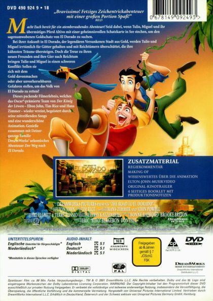 Macht Euch bereit für ein atemberaubendes Abenteuer! Seid dabei, wenn Tulio, Miguel und ihr übermütiges Pferd Altivo mit einer geheimnisvollen Schatzkarte in See stechen, um den sagenumwobenen Goldschatz von El Dorado zu suchen.Bei ihrer Ankunft in El Dorado, der legendären Versunkenen Stadt aus Gold, werden Tulio und Miguel irrtümlich für Götter gehalten und mit Reichtümern überschüttet, die ihre kühnsten Träume übersteigen. Doch die Treue zu ihren neuen Freunden und ihre Gier nach Reichtum bringen Tulio und Miguel in einen schweren Konflikt: Sollen sie sich mit dem Gold davonmachen oder aber unvorhersehbaren Gefahren stellen, um das Volk von El Dorado zu retten?Dieses packende Filmerlebnis, welches das Oscar-prämierte Team von Der König der Löwen - Elton John, Tim Rice und Hans Zimmer - wieder vereint, begeistert durch seine mitreißenden Songs und eine wunderschöne Animation. Genieße zusammen mit Deiner ganzen Familie DreamWorks' urkomisches Abenteuer Der Weg nach El Dorado.