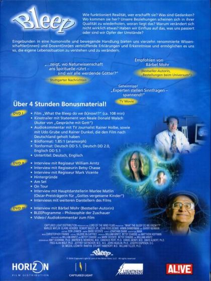 Was ist eigentlich Realität? Was Illusion? Wie funktioniert die Wirklichkeit?"What the Bleep do we know" – "Was glauben wir eigentlich zu wissen?", so der Titel frei übersetzt, ist ein Film über Realitäten. Wie funktioniert Realität, wer erschafft sie? Was sind Gedanken? Wo kommen sie her? Warum kehren Krisen und Leid immer wieder? Unsere Beziehungen scheinen sich in ihrer Qualität zu wiederholen, woran liegt das? Warum verändert sich nicht wirklich etwas? Haben wir Einfluss auf das, was uns passiert oder sind wir Opfer der Umstände?Vierzehn Wissenschaftler und Lehrmeister bieten dem Zuschauer mit ihren Antworten verblüffende Erklärungen und Erkenntnisse, die es dem Zuschauer ermöglichen, die eigene Lebenssituation zu verstehen und zu verändern. Dabei bedienen sie sich der neuesten wissenschaftlichen Erkenntnisse von der Quantenphysik bis hin zur Gehirnforschung. Ihre Aussagen sind jedoch nicht nur wissenschaftlicher Natur. Über den Verlauf des Films verschwimmen zunehmend die Unterschiede von Wissenschaft und Spiritualität und wir beginnen zu erkennen, dass letztlich beide Sichtweisen die gleichen Phänomene beschreiben.Eingebettet in die Dokumentation sind Spiel- und Animationsszenen, gespielt von der Oskar-Preisträgerin Marlee Matlin. Die Animationen, innerhalb der Dokumentation greifen einige komplexe Themenbereiche auf und vermitteln diese auf einfache, anschauliche Art und Weise. Computer animierte Visualisierungen von Peptiden, Neuronen, Zellen, Energiefeldern und Atomen verstärken die wissenschaftlichen Aussagen des Films und bringen auf den Punkt, wie wir die Realität unserer menschlichen Erfahrung verändern können.