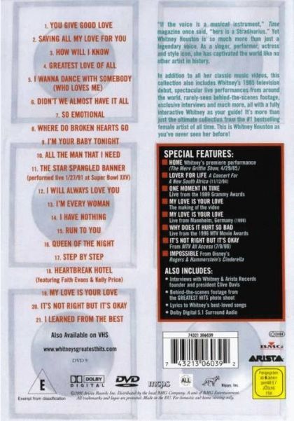"If the voice is a musical instrument," Time magazine once said, "here is a Stradivarius." Yet Whitney Houston is so much more than just a legendary voice. As a singer, performer, actress and style icon, she has captivated the world like no other artist in history.In addition to all her classic music videos, this collection also includes Whitney's 1985 televison debut, spectacular live performances from around the world, rarely-seen behind-the-scenes footage, exclusive interviews and much more, all with a fully interactive Whitney as your guide! It's more than just the ultimate collection from the #1 bestselling female artist of all time. This is Whitney Houston as you've never seen her before!Whitney treats her fans with this impressive tracklist: You Give Good LoveSaving All My LoveHow Will I KnowGreatest Love of AllI Wanna Dance With SomebodyDidn't We Almost Have It AllSo EmotionalWhere Do Broken Hearts GoI'm Your Baby TonightAll the Man that I NeedStar Spangled BannerI Will Allways Love YouI'm Every WomanI Have NothingRun To YouQueen of the NightStep By StepHearbreak HotelMy Love is Your LoveIt's Not Right But It's OkayI Learned from the Best