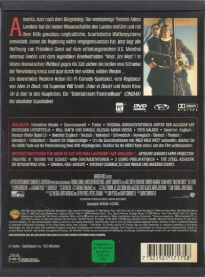 Amerika, kurz nach dem Bürgerkrieg: Der wahnsinnige Terrorist Arless Loveless hat die besten Wissenschaftler des Landes entführt und mit ihrer Hilfe geradezu unglaubliche, futuristische Waffensysteme entwickelt, denen die Regierung nichts entgegenzusetzen hat. Jetzt liegt alle Hoffnung von Präsident Grant auf dem erfindungsreichen U.S. Marshal Artemus Gordon und dem legendären Revolverhelden "West. Jim West"! In einem dramatischen Wettlauf gegen die Zeit ziehen die beiden eine Schneise der Verwüstung kreuz und quer durch den wilden, wilden Westen ...Ein donnerndes Western-Action-Sci-Fi-Comedy-Spektakel, vom Regisseur von Men in Black, mit Superstar Will Smith (Men in Black) und Kevin Kline (In & Out) in den Hauptrollen. Ein "Entertainment-Trommelfeuer" (CINEMA) der absoluten Superlative!