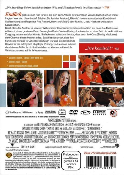 Endlich gibt es einen Film für alle, die sich beim Anblick ihrer schrägen Verwandtschaft schon immer fragten: Wer sind diese Leute? Erleben Sie Jennifer Aniston ("Friends") in einer romantischen Komödie mit Starbesetzung von Regisseur Rob Reiner ("Harry und Sally") über Familie, Liebe, Hochzeit und andere Katastrophen.Sarah (Jennifer Aniston) ist verwirrt. Während der Hochzeit ihrer Schwester erfährt sie, dass ihre Mutter eine Affäre mit einem gewissen Beau Burroughs (Kevin Costner) hatte; pikanterweise zu einer Zeit, die exakt mit ihrer Zeugung zusammenfallen könnte. Sie bekommt außerdem heraus, dass auch ihre Oma (Shirley MacLaine) dem Charme dieses Mannes erlag. Sarah ist überzeugt, dass ihre Familie die Vorlage für "Die Reifeprüfung" war und sie der lebende Beweis für die erfolgreich abgelegte Prüfung. Und auch sie scheint dem Internet-Millionär nicht widerstehen zu können, während ihr Verlobter zuhause auf ihr Ja-Wort wartet...