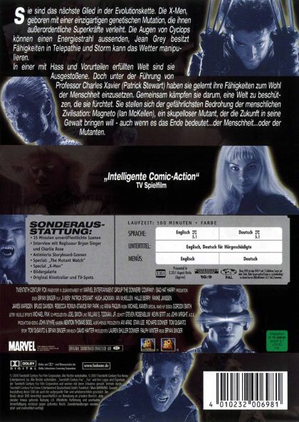 Sie sind das nächste Glied in der Evolutionskette. Die X-Men, geboren mit einer einzigartigen genetischen Mutation, die ihnen außerordentliche Superkräfte verleiht. Die Augen von Cyclops können einen Energiestrahl aussenden, Jean Grey besitzt Fähigkeiten in Telepathie und Storm kann das Wetter manipulieren.In einer mit Hass und Vorurteilen erfüllten Welt sind sie Ausgestoßene. Doch unter der Führung von Professor Charles Xavier (Patrick Stewart) haben sie gelernt ihre Fähigkeiten zum Wohl der Menschheit einzusetzen. Gemeinsam kämpfen sie darum, eine Welt zu beschützen, die sie fürchtet. Sie stellen sich der gefährlichsten Bedrohung der menschlichen Zivilisation: Magneto (Ian McKellen), ein skrupelloser Mutant, der die Zukunft in seine Gewalt bringen will - auch wenn es das Ende bedeutet... der Menschheit... oder der Mutanten.
