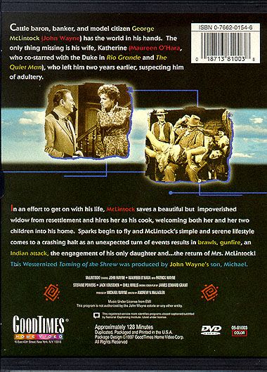 McLintock! is a 1963 comedy Western starring John Wayne and Maureen O'Hara, and loosely based on Shakespeare's The Taming of the Shrew. The film is famous (or infamous) for its two spanking scenes, in which mother and daughter are each paddled with coal shovels: the daughter by her suitor, the mother by her estranged husband.