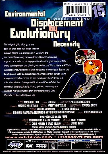 Agerna is a planet rich in Vizorium, the one mineral necessary to space travel. When a series of mysterious attacks on mining operations has world leaders pointing fingers and pinning blame, 3WA naturally send in their top agents to investigate. But are the Lovely Angels up to the task of stopping a mad scientist bent on taking a long dormant alien race to its final evolutionary form? Throw in a thief after a bottle of WWII-vintage wine and it's a safe bet that nobody's safe. It's more chaos, more mayhem, and even more destruction than ever before as the Dirty Pair take on their wildest case yet!