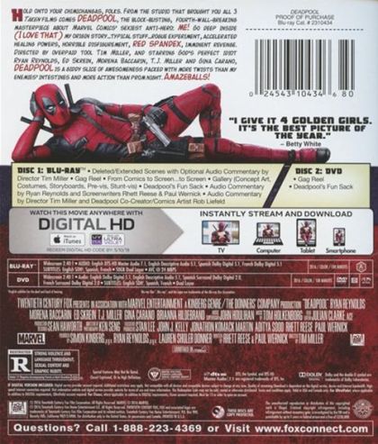 Based upon Marvel Comics’ most unconventional anti-hero, DEADPOOL tells the origin story of former Special Forces operative turned mercenary Wade Wilson, who after being subjected to a rogue experiment that leaves him with accelerated healing powers, adopts the alter ego Deadpool. Armed with his new abilities and a dark, twisted sense of humor, Deadpool hunts down the man who nearly destroyed his life.