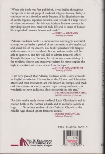 Though buffetted on all sides by rapid and at times cataclysmic social, political, and economic change, the medieval church was able to make adjustments that kept it from becoming simply a fossil from the past rather than an enduring institution of salvation.The dynamic interaction between the medieval church and society gives form to this compelling and well-informed study by Adriaan Bredero. By considering medieval Christianity in full relation to its historical context, Bredero elucidates complex medieval realities - many of which run counter to common modern notions about the Middle Ages. Bredero moves beyond the usual treatment of history by framing his overall discussion in terms of a fascinating and relevant question: To what extent is Christianity today still molded by medieval society?The book begins with an overview of religion and the church in medieval society, from the early Christianization of Western Europe through the fifteenth century. Bredero counters earlier romanticized assessments of the Middle Ages as a thoroughly Christian period by arriving at a definition of Christendom, not in its original sense as the empire of Charlemagne, but rather as "the countries, people, and matters which stood under the influence of Christ."Other chapters develop the following topics: medieval conceptions of reality that are prone to modern misunderstanding, such as a view of time that distinguished the distant, "ancient" past - an ideal, golden age - from the recent, "modern" past - an inferior, sub-Christian time - a concept that led to the rise of millenarianism; the role of Jerusalem in Western Christian thought - as a goal for pilgrims, a motivation for the Crusades, and a source of holy relics; the "Truce of God" movement as an attempt by bishops to restore peace, along with an analysis of its motives, limitations, and consequences; the rise of the Cistercian and Cluniac orders as reform movements within monasticism, with particular attention to the role of Bernard of Clairvaux; the veneration of saints, the nature of sainthood, and the growing authority of the pope in determining who was to be called a "saint"; Peter Abelard and his peculiar adversities; the evolution from the ideals of Francis of Assisi to the lifestyle of the Franciscan order.In an important and particularly intriguing chapter, Bredero deals with anti-Jewish feelings in the Middle Ages, examining how both the medieval church and society at large persecuted the Jews.