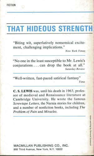 Written during the dark hours immediately before and during the Second World War, C S Lewis's Space Trilogy, of which That Hideous Strength is the third volume, stands alongside such works as Albert Camus's The Plague and George Orwell's 1984 as a timely parable that has become timeless, beloved by succeeding generations as much for the sheer wonder of its storytelling as for the significance of its moral concerns--For the trilogy's central figure, C S Lewis created perhaps the most memorable character of his career, the brilliant, clear-eyed, and fiercely brave philologist Dr Elwin Ransom. Appropriately, Lewis modeled Dr. Ransom on his dear friend J. R. R. Tolkien, for in the scope of its imaginative achievement and the totality of its vision of not one but two imaginary worlds, the Space Trilogy is rivaled in this century only by Tolkien's trilogy The Lord of the Rings. Readers who fall in love with Lewis's fantasy series The Chronicles of Narnia as children unfailingly cherish his Space Trilogy as adults; it, too, brings to life strange and magical realms in which epic battles are fought between the forces of light and those of darkness. But in the many layers of its allegory, and the sophistication and piercing brilliance of its insights into the human condition, it occupies a place among the English language's most extraordinary works for any age, and for all time.In That Hideous Strength, the final installment of the Space Trilogy, the dark forces that have been repulsed in Out of the Silent Planet and Perelandra are massed for an assault on the planet Earth itself. Word is on the wind that the mighty wizard Merlin has come back to the land of the living after many centuries, holding the key to ultimate power for the force that can find him and bend him to its will. A sinister technocratic organization that is gaining force throughout England, N.I.C.E. (the National Institute of Coordinated Experiments), secretly controlled by humanity's mortal enemies, plans to use Merlin in their plot to "recondition" society. Dr. Ransom forms a countervailing group, Logres, in opposition, and the two groups struggle to a climactic resolution that brings the Space Trilogy to a magnificent, crashing close.