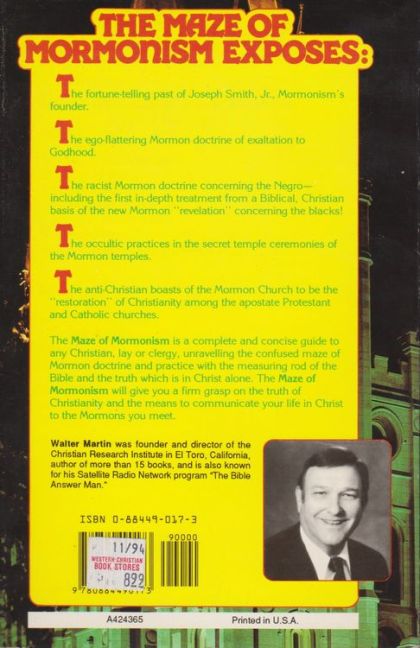 The Maze of Mormonism exposes: *The fortune-telling past of Joseph Smith, Jr., Mormonism's founder. * The ego flattering Mormon doctrine of Exaltation to Godhood. * The racist Mormon doctrine concerning the Negro - including the first in-depth treatment from a Biblical Christian basis of the Mormon "revelation" concerning the blacks! * The occultic practices in the secret temple ceremonies of the Mormon temple. * The anti-Christian boasts of the Mormon Church to be the "restoration" of Christianity among the apostate Protestant and Catholic churches. The Maze of Mormonism is a complete and concise guide to any Christian, lay or clergy, unraveling the confused maze of Mormon Doctrine and practice with the measuring rod of the Bible and the truth which is in Christ alone. The Maze of Mormonism will give you a firm grasp on the truth of Christianity and the means to communicate your life in Christ to the Mormons you meet. --- from book's back cover