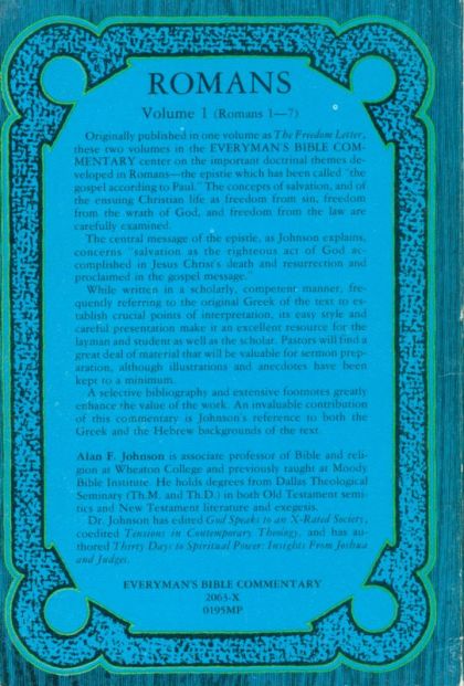 The book of Romans is one of the best-loved books in the entire Bible. Paul's explanation of the doctrine of justification by faith is rooted deep within the hearts of most Christians. Further, the acknowledgment that we are not under law, but under grace has given Christians freedom from the bondage of legalism for centuries.However, Romans is a complex book filled with difficult theology. To make this revolutionary book more accessible to the common man, Alan Johnson has written Everyman's Bible Commentary on Romans. The original two volumes are now combined into one complete volume. The commentary is also updated, expanded, and revised. The easy style and careful presentation make this an excellent commentary for laymen and pastors alike.Study Paul's discussion of the believer's new life in Christ, with their release from sin and death, and the faithfulness of God. Be encouraged and strengthened with a more in-depth understanding of your position before Christ with this commentary on Romans.