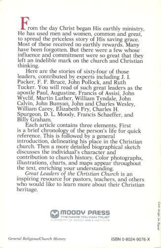 " ... See how God used flawed saints to do His will, guiding different personalities to do His work. The book is a must for those who are interested in the life of Christians throughout the church history ... [The book] covers from Apostle Peter and Paul to Evangelist Billy Graham (... 64 people) ... [It] is not meant to be a comprehensive work, but an introduction to their lives so that we can begin to acquaint ourselves with them. And if you want to further study the individual(s), there is a "Further Reading" section at the end of the book ... It covers most influential [individuals] ... throughout church history ... there is a limited treatment for Eastern Church Fathers (i.e., there is no coverage for Cappadocian Fathers) ... The book is colorful and has many pictures to make the reading interesting and inspiring. It also has a helpful chart of time line[s] for each person to show the glimpse of their life quickly"--Amazon.com.