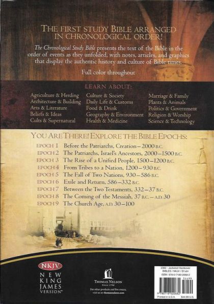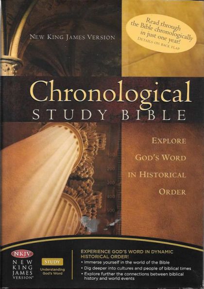 Take a journey through the history and culture of the Bible with the only study Bible that unfolds in historical order.The Chronological Study Bible presents the text of the New King James Version in chronological order - the order in which the events actually happened - with notes, articles, and full-color graphics that connect the reader to the history and culture of Bible times. It is the only NKJV study Bible arranged in chronological order.Features include: The entire NKJV text with translators' notes, arranged in chronological order, provides absorbing and effective Bible studyFull-color illustrations of places, artifacts, and cultural phenomena give the reader a dramatic, "you are there" experienceFascinating articles connect the Bible text to world history and cultureDaily Life Notes help you relate to how people lived in Bible timesTime Panels and Charts show the flow of Bible historyIn-text and full-page color maps of the biblical world provide a visual representation of Israel and other biblical locations for better contextEasy-to-read large10-point type sizePart of the Signature Series line of Thomas Nelson BiblesChronological Study Bibles sold to date: More than 400,000The New King James Version(R) - More than 60 million copies sold