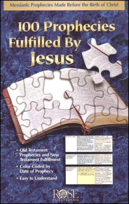 A list of more than 100 prophecies Jesus Christ fulfilled during his time on earth.This Christian pamphlet speaks to the very heart of the hope we have in Christ--and it explains prophecies about Jesus and their fulfillment. It's amazing to discover that Jesus fulfilled more than 100 prophecies foretold 400--1500 years before his birth.100 Prophecies Fulfilled by Jesus contains a helpful chart that presents Old Testament prophecies that are divided into those regarding Jesus' Birth, Jesus' Life and Ministry, and Jesus' Death and Resurrection and the New Testament fulfillments of each prophecy. Also included are Jesus' Titles and Attributes mentioned in both Old and New Testaments. This pamphlet makes an excellent Bible study or reference tool and will help you share the amazing story of the Old Testament's promise of the Messiah's coming and the New Testament's glorious fulfillment of those promises.Here are some prophesies found in the 100 Prophecies Fulfilled by Jesus pamphlet: Prophecies about Jesus' BirthProphecy: Be of the tribe of JudahOld Testament References: Genesis 49:8 10, "Judah, your brothers will praise you. . . . The scepter will not depart from Judah, nor the ruler's staff from between his feet, until he comes to whom it belongs and the obedience of the nations is his."New Testament Fulfillment: Matthew 1:13, "A record of the genealogy of Jesus Christ the son of David, the son of Abraham. . . . Jacob the father of Judah and his brothers, Judah the father of Perez and Zerah. . . ."Prophecies about Jesus' Life and MinistryProphecy: The King comes to Jerusalem riding on a donkeyOld Testament References: Zechariah 9:9, "See, your king comes to you, righteous and having salvation, gentle and riding on a donkey, on a colt, the foal of a donkey."New Testament Fulfillment: Mark 11:7, "When they brought the colt to Jesus and threw their cloaks over it, he sat on it. . . ."Prophecies about Jesus' Death and ResurrectionProphecy: Be hung upon a tree as a curse for usOld Testament References Deuteronomy 21:23, "Be sure to bury him that same day, because anyone who is hung on a tree is under God's curse. You must not desecrate that land the LORD your God is giving you as an inheritance."New Testament Fulfillment Galatians 3:13, "Christ redeemed us from the curse of the law by becoming a curse for us, for it is written; "Cursed is everyone who is hung on a tree."100 Prophecies Fulfilled by Jesus "color codes" the Old Testament prophecies so you can see the number of years they were made before the birth of Christ.