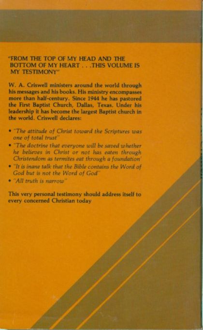 ""The invitation to write this book 'from the top of my head and from the bottom of my heart' was accepted with the earnest and prayerful hope that it might encourage other ministers to preach the Bible as the literal, inspired, God-breathed truth of heaven. The Lord has so greatly blessed me in preaching from this conviction that I covet for every pastor alike supernal experience. I have written...a testimony from my heart, how I feel about God's Word; and from my best judgment, what I have factually observed in my extended ministry and in the ministries of others concerning the preaching of the Bible This volume is my Testimony." In his own words, this explains the purpose of W. A. Criswell in presenting this, his latest book, to an interested public. Perhaps no other Baptist pastor--within or without the Southern Baptist Convention--is better known for his theological stance in favor of the inerrancy of the Bible. Few, if any, ministers in this modern era can match their records of visible success against those of this popular Dallas pastor, now in the 41st year of his ministry and his 25th year as undershepherd of the largest Baptist congregation in the world. Because of his past record of success as a preacher and his present preeminent position in his denomination, what Dr. Criswell has to say will be of wide interest to those who may disagree with his position as well as to those who are followers of his example. This book contains experiences and illustrations from the author's brilliant career, an explanation of why he preaches as he does, and a fervent call to other preachers especially in these particularly troublous times, to emulate his example. This very personal testimony should address itself to every concerned Christian today."