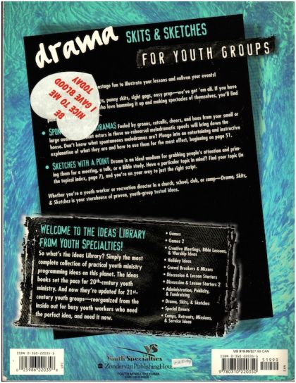 80 plus youth-group-tested scripts you can use to introduce a topic with flair ... To retell a Bible story with humor ... To apply your lessons with poignancy. And they're flexible, too -- have fun with them as informal, no-prep reader's theater, or rehearse them seriously for polished performances. - Scripture Sketches ... Don't despair if your students can't tell the difference between The Rich Fool and Habakkuk -- the Bible will be brought to life for them as they act out scriptural episodes, stories, and passages ... Here are right-now, real-life scripts for everything from event announcements (that you can tailor to your own events) to dealing with emotional scars. Thanks to the topical index on page 7, you can zip right to the script that fits your meeting. -- TV Takeoffs ... In a TV world of talk shows and sitcoms, sketches based on TV shows always kick off lively discussions. Since all these scripts are also humorous, they're great as openers at camps and conferences, too. -- Monologues ... Does your youth group's dramatic talent reside in only one or two students? Or do you want to raise interest in starting a drama ministry? A monologue is your ticket -- one-person scripts that require little or no costumes or props, yet can be as powerful as a three-act play. -- To the Tune of CCM (And More) ... Take the music many of your students listen to, and use it for dramatic purposes! These scripts each use a song by a Christian artist (or a song whose lyrics encourage or challenge Christians) -- From Amazon.com.