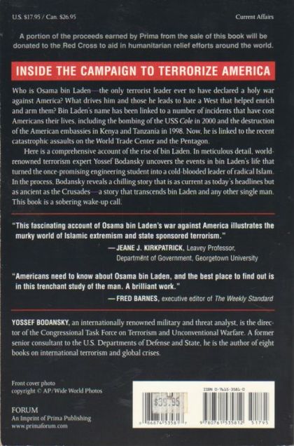 Who is Osama bin Ladenthe only terrorist leader ever to have declared a holy war against America? What drives him and those he leads to hate a West that helped enrich and arm them? Bin Laden's name has been linked to a number of incidents that have cost Americans their lives, including the bombing of the USSColein 2000 and the destruction of the American embassies in Kenya and Tanzania in 1998. Now, he is linked to the recent catastrophic assaults on the World Trade Center and the Pentagon. Here is a comprehensive account of the rise of bin Laden. In meticulous detail, world-renowned terrorism expert Yossef Bodansky uncovers the events in bin Laden's life that turned the once-promising engineering student into a cold-blooded leader of radical Islam. In the process, Bodansky reveals a chilling story that is as current as today's headlines but as ancient as the Crusadesa story that transcends bin Laden and any other single man. This book is a sobering wake-up call. "This fascinating account of Osama bin Laden's war against America illustrates the murky world of Islamic extremism and state sponsored terrorism." Jeane J. Kirkpatrick,Leavey Professor, Department of Government, Georgetown University "Americans need to know about Osama bin Laden, and the best place to find out is in this trenchant study of the man. A brilliant work." Fred Barnes,executive editor ofThe Weekly Standard