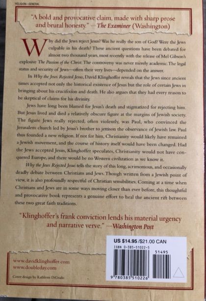 Why did the Jews reject Jesus? Was he really the son of God? Were the Jews culpable in his death? These ancient questions have been debated for almost two thousand years, most recently with the release of Mel Gibson’s explosive The Passion of the Christ. The controversy was never merely academic. The legal status and security of Jews—often their very lives—depended on the answer. In WHY THE JEWS REJECTED JESUS, David Klinghoffer reveals that the Jews since ancient times accepted not only the historical existence of Jesus but the role of certain Jews in bringing about his crucifixion and death. But he also argues that they had every reason to be skeptical of claims for his divinity. For one thing, Palestine under Roman occupation had numerous charismatic would-be messiahs, so Jesus would not have been unique, nor was his following the largest of its kind. For another, the biblical prophecies about the coming of the Messiah were never fulfilled by Jesus, including an ingathering of exiles, the rise of a Davidic king who would defeat Israel’s enemies, the building of a new Temple, and recognition of God by the gentiles. Above all, the Jews understood their biblically commanded way of life, from which Jesus’s followers sought to “free” them, as precious, immutable, and eternal.Jews have long been blamed for Jesus’s death and stigmatized for rejecting him. But Jesus lived and died a relatively obscure figure at the margins of Jewish society. Indeed, it is difficult to argue that “the Jews” of his day rejected Jesus at all, since most Jews had never heard of him. The figure they really rejected, often violently, was Paul, who convinced the Jerusalem church led by Jesus’s brother to jettison the observance of Jewish law. Paul thus founded a new religion. If not for him, Christianity would likely have remained a Jewish movement, and the course of history itself would have been changed. Had the Jews accepted Jesus, Klinghoffer speculates, Christianity would not have conquered Europe, and there would be no Western civilization as we know it. WHY THE JEWS REJECTED JESUS tells the story of this long, acrimonious, and occasionally deadly debate between Christians and Jews. It is thoroughly engaging, lucidly written, and in many ways highly original. Though written from a Jewish point of view, it is also profoundly respectful of Christian sensibilities. Coming at a time when Christians and Jews are in some ways moving closer than ever before, this thoughtful and provocative book represents a genuine effort to heal the ancient rift between these two great faith traditions.