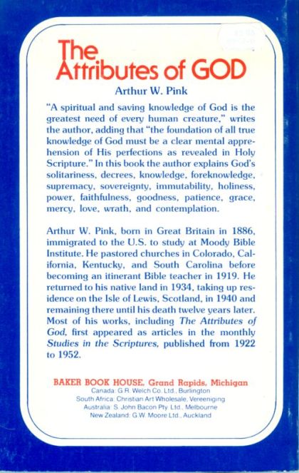 An explanation of God's solitariness, decrees, knowledge, foreknowledge, supremacy, sovereignty, immutability, holiness, power, faithfulness, goodness, patience, grace, mercy, love, wrath, and contemplation. Arthur Walkington Pink (1886-1952) was an English Christian evangelist and Biblical scholar known for his staunchly Calvinist and Puritan-like teachings. After Pink's death, his works were republished by a number of publishing houses and reached a much wider audience as a result. Biographer Iain Murray observes of Pink, "the widespread circulation of his writings after his death made him one of the most influential evangelical authors in the second half of the twentieth century." His writing sparked a revival of expository preaching and focused readers' hearts on biblical living.