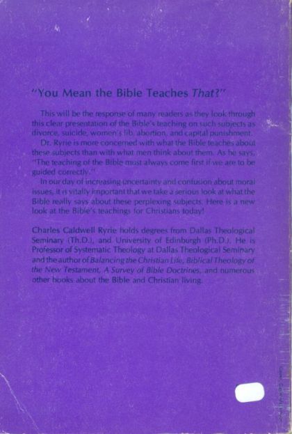 Did you know that the Bible addresses Civil Disobedience, Capital Punishment, Women's Lib, Divorce, Race, Situation Ethics, Suicide, Abortion, Demon Activity and Evolution? CHARLES C. RYRIE (A.B., Haverford College; Th.M. and Th.D., Dallas Theological Seminary; Ph.D., University of Edinburgh; Litt.D., Liberty Baptist Theological Seminary) is a renowned author and scholar. He has written numerous books, including The Ryrie Study Bible, Basic Theology, Balancing the Christian Life, The Holy Spirit, Dispensationalism Today, Revelation, Survey of Bible Doctrine, and So Great Salvation, which rank among his best-selling titles. Dr. Ryrie is the father of three children and resides in Dallas, Texas.