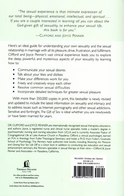 Are you hoping to reignite the passion in your relationship? Join Clifford and Joyce Penner as they share the time-tested secrets to finding fulfillment in your marriage. Clifford, a licensed clinical psychologist, and Joyce, a registered nurse and clinical nurse specialist, have been married for forty years--and they know firsthand that there are countless barriers that can get in the way of experiencing love and commitment, from anger or a lack of respect to external tension. But these obstacles don't have to last forever. In The Gift of Sex, the Penners give you the tools you need to move past those barriers and embrace marriage as God intended it. This revised and updated version of The Gift of Sex features a new introduction, new illustrations, a section on addictions and the Internet, and a timely discussion on sexually transmitted diseases and their consequences. It also asks and answers key questions about biblical marriage, including: How does sex fit into God's design for marriage? Why did God create men and women to think about sex differently? How can I light the spark in my relationship again? Whether you're newlyweds or you've been married for decades, The Gift of Sex is a timeless guide to discovering the sexual fulfillment that you and your spouse deserve.