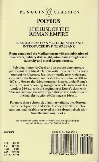 in writing his account of the relentless growth of the Roman Empire, the Greek statesman Polybius (c. 200-118 BC) goes out to help his fellow countrymen understand how their world came to be dominated by Rome. Opening with the Punic War in 264 BC, he vividly records the critical stages of Roman expansion: its campaigns throughout the Mediterranean, the temporary putbacks inflicted by Hannibal and the final destruction of Carthage in 146 BC. An active participant in contemporary politics as well as a friend of many prominent Roman citizens, Polybius was able to draw on a range of eyewitness accounts and on his own experiences of many of the central events, giving his work immediacy and authority. ian Scott-Kilvert's translation fully preserves the clarity of Polybius' narrative. This substantial selection of the surviving volumes is accompanied by an introduction by F.W.Walbank, which examines Polybius' life and times, and the sources and techniques he employed in writing his history.