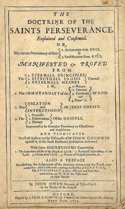 Written to answer Redemption Redeemed by the Arminian, John Goodwin, this book is a refutation of Goodwin's views. Owen believes the more Calvinist view of perseverance of the saints, that once an individual is saved, he or she will always be saved -- that is, cannot regress back into unbelief. Some readers find Owen's arguing with Goodwin distracting -- in the words of Andrew Thompson, the book would "be almost as complete were every part of it that refers Goodwin expunged, and undeniably forms the most masterly vindication of the perseverance of the saints in the English tongue." But the work is a proficient explanation and argument for the perseverance of the saints, and readers interested in the issue would do well to read Goodwin's Redemption Redeemed as well.
