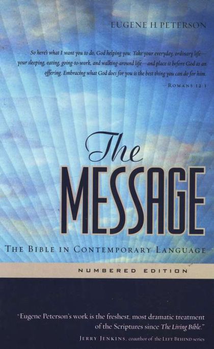 Open The Message and God's Word Comes Alive!Discover the surprise and wonder of God's Word. The Message Bible promises to immerse your imagination and stir your faith. Hear God's heart speaking your heart's language.The Message is a reading Bible translated from the original Hebrew and Greek Scriptures by scholar, pastor, author, and poet Eugene Peterson. Thoroughly reviewed and approved by twenty biblical scholars, The Message combines the authority of God's Word with the cadence and energy of conversational English.What makes The Message the best reading Bible? Discover for yourself!Feel the impact of a Bible translated into conversational English.Enjoy the familiar one-column design, like books you're used to.Find passages with The Message's unique verse-numbered paragraphs.See the big picture with "The Story of the Bible in Five Acts," alongside a handcrafted timeline and charts.Keep your place with a satin ribbon marker.Come and delight in the unexpected passion and personality that fill God's Word.