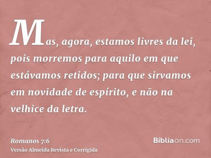 Mas agora fomos libertos da lei, mortos para aquilo pelo qual fomos retidos, para servir em novidade de Espírito e não na obsolescência da letra (Rm 7:6).
