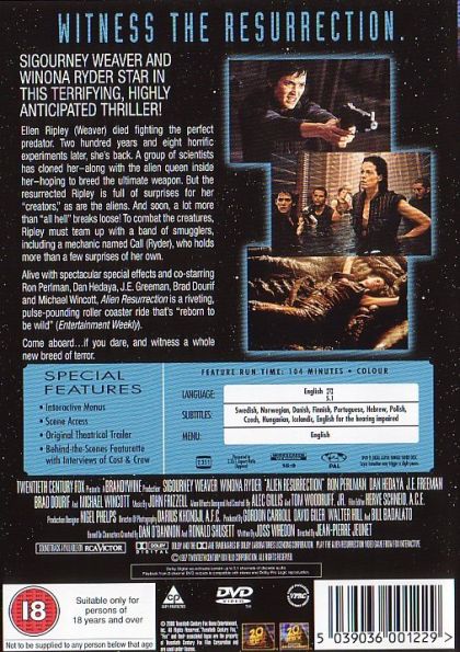 Alien: Resurrection, the fourth entry in the franchise, is directed by French stylist Jean-Pierre Jeunet in a much more straightforward action-adventure manner than its predecessor, the dark and confusing Alien 3. This chapter is set even further in the future, where scientists on a space colony have cloned both the alien and Ripley (Sigourney Weaver), who died in Alien 3; in doing so, however, they've mixed alien DNA with Ripley's human chromosomes, which gives Ripley surprising power (and a bad attitude). A band of smugglers comes aboard only to discover the new race of aliens--and when the multi-mouthed melon heads get loose, no place is safe. But, on the plus side, they have Ripley as a guide to help them get out. Winona Ryder is on hand as the smugglers' most unlikely crew member (with a secret of her own), but this one is Sigourney's all the way. --Marshall Fine, Amazon.com