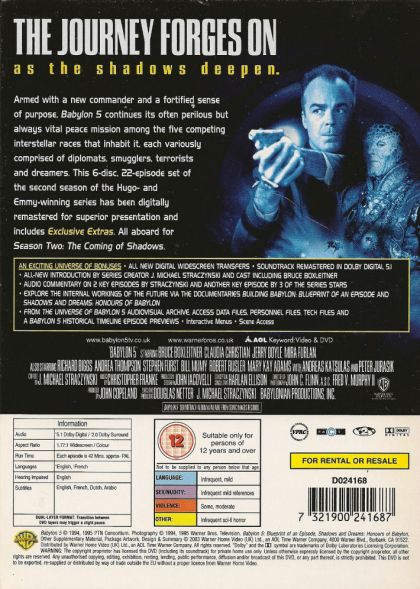 On the DVD: Babylon 5--Series 2 presents all 22 episodes anamorphically enhanced at 16:9, with Dolby Digital 5.1 sound. Originally shot with eventual widescreen presentation in mind, the programmes looks far better than they did when broadcast. The effects shots, reformatted from full-screen CGI, show occasional pixilation, but the new compositions are more dynamic than the old 4:3. Always a show with powerful audio, the remixed soundtrack is rich and involving, if lacking in the bass punch and complex layering of much more expensive cinema productions. Extras are an introduction to Series 2 (eight mins) and Building Babylon: Blueprint of an Episode (13 mins), is a perfunctory promotional piece. More interesting is Shadows and Dreams, an eight-minute feature on B5's two Hugo Awards. Three episodes have commentaries, with J Michael Straczynski examining the politics, mythology and production of In the Shadow of Z'Ha'Dum and The Fall of Night, and stars Bruce Boxleitner, Claudia Christian and Jerry Doyle have a decidedly low-brow laugh-fest through The Geometry of Shadows. There is an alternative French soundtrack and subtitles for the hard-of-hearing. --Gary S Dalkin