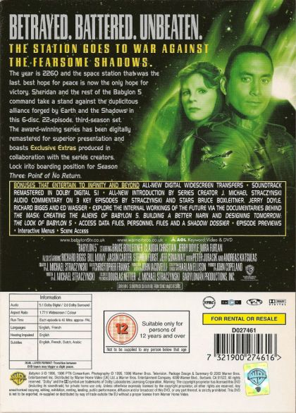 "Interludes and Examinations" presents the death of a major supporting character, while the two-part "War Without End" reaches apocalyptic dimensions in a complex tale resolving the destiny of Sinclair and the fate of Babylon 4 (dovetailing elegantly with the events of Year One's "Babylon Squared"), resolving a 1,000-year-old paradox and presenting a vision of a very dark future for Sheridan and Delenn. All this is trumped by the monumental "Z'ha'dum". In the preceding "Shadow Dancing", Anna Sheridan (Melissa Gilbert, Bruce Boxleitner's real-life wife) returns from the dead, no longer entirely human. In the mythologically resonant climax Anna invites Sheridan back to the Shadow homeworld with no hope of survival. Just as Gandalf fell into the abyss at Khazad-Dum, so Sheridan takes a comparable leap into the unknown on an alien world. --Gary S Dalkin