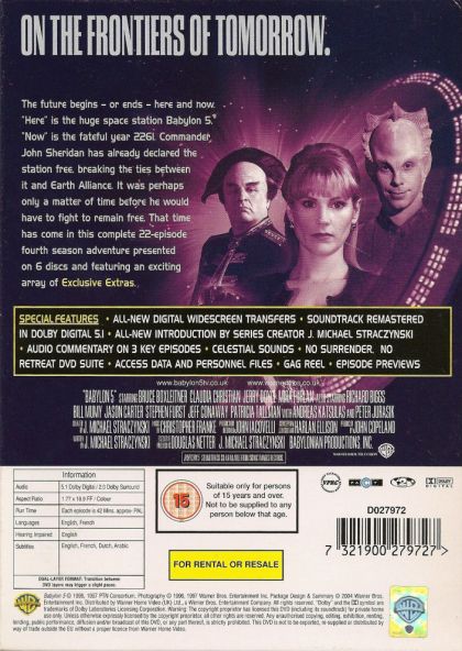 The fourth series of Babylon 5 begins on a high point with Centauri Prime in the grip of the insane Emperor Cartagia (Wortham Krimmer) and a run of six shows leading to the climax of the war against the Shadows in "Into the Fire". If this colossal narrative is resolved a little too easily and the ultimate aim of the Shadows turns out to be a tad disappointing, it's still one of the most powerful slices of space opera ever to grace the small screen.