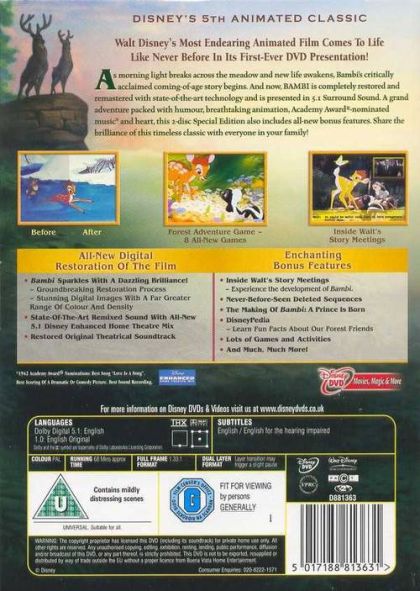 It always comes up when people are comparing their most traumatic movie experiences: "the death of Bambi's mother," a recollection that can bring a shudder to even the most jaded filmgoer. That primal separation (which is no less stunning for happening off-screen) is the centerpiece of Bambi, Walt Disney's 1942 animated classic, but it is by no means the only bold stroke in the film. In its swift but somehow leisurely 69 minutes, Bambi covers a year in the life of a young deer. But in a bigger way, it measures the life cycle itself, from birth to adulthood, from childhood's freedom to grown-up responsibility. All of this is rendered in cheeky, fleet-footed style--the movie doesn't lecture, or make you feel you're being fed something that's good for you. The animation is miraculous, a lush forest in which nature is a constantly unfolding miracle (even in a spectacular fire, or those dark moments when "man was in the forest"). There are probably easier animals to draw than a young deer, and the Disney animators set themselves a challenge with Bambi's wobbly glide across an ice-covered lake, his spindly legs akimbo; but the sequence is effortless and charming. If Bambi himself is just a bit dull--such is the fate of an Everydeer--his rabbit sidekick Thumper and a skunk named Flower more than make up for it. Many of the early Disney features have their share of lyrical moments and universal truths, but Bambi is so simple, so pure, it's almost transparent. You might borrow a phrase from Thumper and say it's downright twitterpated. --Robert Horton