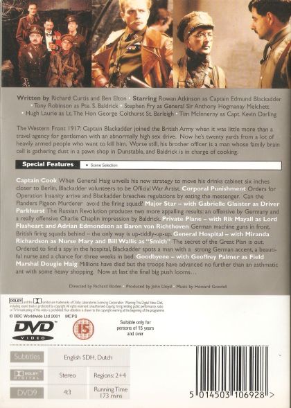 Through four series and a few specials, Edmund Blackadder and his greasy sidekick Baldrick conjure up cunning plans as Edmund tries to take advantage of desperate times. These "situation tragedies" had obvious parallels from the Dark Ages to Elizabethan times, the rule of mad George III, and The Great War. Some character names from the first series are open to debate as they are shown in fancy script on screen, usually against unhelpful backgrounds.