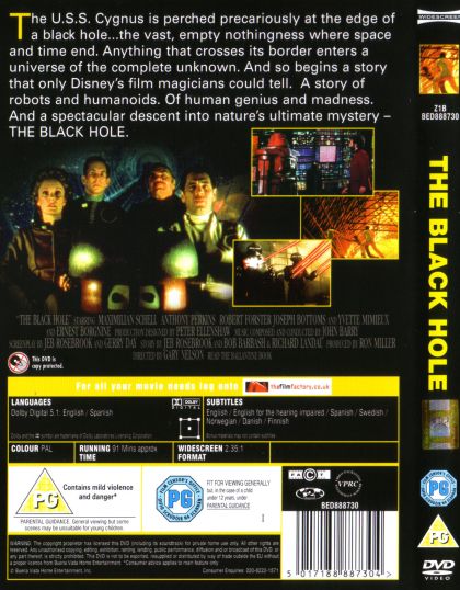 In a classic science fiction story two ships at the edge of black hole interact with each other in strange and fascinating ways. In the year 2130 the spaceship USS Palomino has been sent to investigate a ship, the Cygnus, on the event horizon of a black hole. When they arrive they get in to some trouble with their ship and need some parts, this is when the Cygnus mysteriously comes to life. The crew of the Palomino: Dan Holland (Robert Forster), Charlie Pizer (Joseph Bottoms), Harry Booth (Ernest Borgnine), Dr. Alex Durant (Anthony Perkins), and Kate McCrae (Yvette Mimieux), along with V. I.N. CENT, their maintenance robot, must board the Cygnus if they hope to escape the black hole. On board the Cygnus they find Dr. Hans Reinhardt (Maximillian Schell), who went missing with the ship twenty years before. The crew of the Palomino discover some strange and interesting things once aboard the Cygnus, will they survive the encounter?