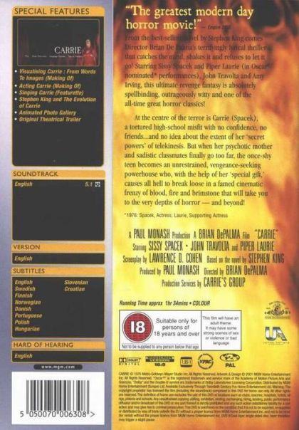 This terrifying adaptation of Stephen King's bestselling horror novel was directed by shock maestro Brian De Palma for maximum, no-holds-barred effect. Sissy Spacek stars as Carrie White, the beleaguered daughter of a religious kook (Piper Laurie) and a social outcast tormented by her cruel, insensitive classmates. When her rage turns into telekinetic powers, however, school's out in every sense of the word. De Palma's horrific climax in a school gym lingers forever in the memory, though the film is also built upon Spacek's remarkable performance and Piper Laurie's outlandishly creepy one. John Travolta has a small part as a thug, De Palma's future wife, Nancy Allen, is his girlfriend, and Amy Irving makes her screen debut as one of the girls giving Carrie a hard time.--Tom Keogh