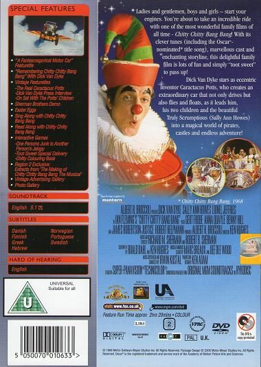 On the DVD: Chitty Chitty Bang Bang Special Edition comes to DVD in widescreen format with a Dolby soundtrack to recreate the authentic cinematic experience for everyone who remembers it from the first time round. The picture quality is robust, revealing some rather homespun aspects to the special effects. Extras are dominated by Dick Van Dyke remembering his time on the film, plus a short item on the origins of the car itself and various trailers. --Piers Ford