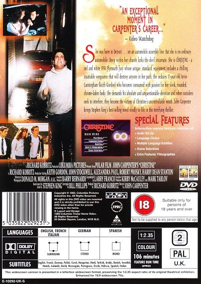 She can't (and won't) drive 55.... Stephen King's novel about the twisted love affair between a boy and his car gets transferred to the screen, courtesy of suspense master John Carpenter. Although lacking some of the more outré supernatural elements of the source material, this high-octane cinematic tune-up more than delivers the goods, horror-wise (Christine's midnight rampages will never be forgotten)--as well as being a sly exposé of the random cruelties within the high-school pecking order. Keith Gordon (who has gone on to become a stellar director in his own right, with films such as A Midnight Clear and Mother Night to his credit) gives a wonderfully controlled central performance. Carpenter's atmospheric original score is backed up by a well-chosen collection of rock classics, including George Thorogood's "Bad to the Bone" (the titular character's all-too-apt theme song). --Andrew Wright, Amazon.com