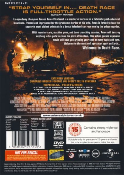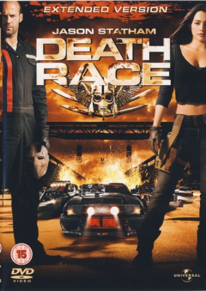 Deathrace is an action thriller which is set in a future in which prisons are moneymaking entities run by corporations. Jensen Ames (Jason Statham) is a former race car driver who is wrongfully convicted of murder and imprisoned. In the world of Deathrace, a prisoner can earn his freedom if he wins five no-holds-barred lethal car races. Warden Hennessey (Joan Allen) is the evil prison director who is determined to profit from the televised mayhem. One of the most popular drivers is the masked Frankenstein. Frankenstein has died, but the warden wants Jensen to pose as Frankenstein for one last deadly race. She promises that Jensen will be freed if he wins the race. Jensen is aided in this cause by his head mechanic “Coach” (Ian McShane), who helps to build the armed and armored killing machine of a vehicle.