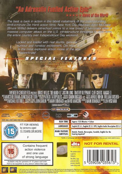 Twelve years after Die Hard with a Vengeance, the third and previous film in the Die Hard franchise, Die Hard 4.0 finds John McClane (Bruce Willis) a few years older, not any happier, and just as kick-ass as ever. Right after he has a fight with his college-age daughter (Mary Elizabeth Winstead), a call comes in to pick up a hacker (Justin Long, Dodgeball) who might help the FBI learn something about a brief security blip in their systems. Now any Die Hard fan knows that this is when the assassins with foreign accents and high-powered weaponry show up, telling McClane that once again he's stumbled into an assignment that's anything but routine. Once that wreckage has cleared, it is revealed that the hacker is only one of many hackers who are being targeted for extermination after they helped set up a "fire sale," a three-pronged cyberattack designed to bring down the entire country by crippling its transportation, finances, and utilities. That plan is now being put into action by a mysterious team (Timothy Olyphant, Deadwood, and Maggie Q, Mission: Impossible 3) that seems to be operating under the government's noses. Die Hard 4.0 uses some of the cat-and-mouse elements of Die Hard with a Vengeance along with some of the pick-'em-off-one-by-one elements of the now-classic original movie. And it's the most consistently enjoyable installment of the franchise since the original, with eye-popping stunts (directed by Len Wiseman of the Underworld franchise), good humour, and Willis's ability to toss off a quip while barely alive. Yippee-ki-ay! --David Horiuchi
