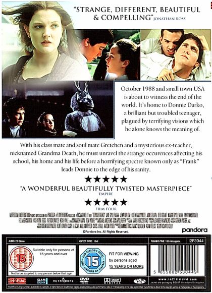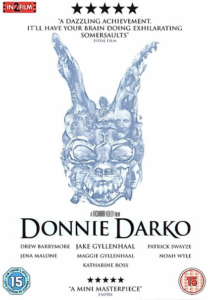 Donnie Darko is an average highschool boy with too many problems at home and too many prescription anti-depressant drugs in his body. He is visited by an imaginary friend Frank: a man dressed in a bunny suit with a demonic mask for a face. Frank's influence on Donnie first results in Donnie waking up in his pajamas in the middle of a road, then in Donnie flooding the school at night, then with Donnie committing arson. Frank justifies his influence by telling Donnie that he is in danger, and, while he does wind up exposing a TV personality (Patrick Swayze) for who he really is, most of the crimes seem to be meaningless until the end, when all the threads come together to make Donnie understand that his life is determined by his actions, and the end is inescapable.