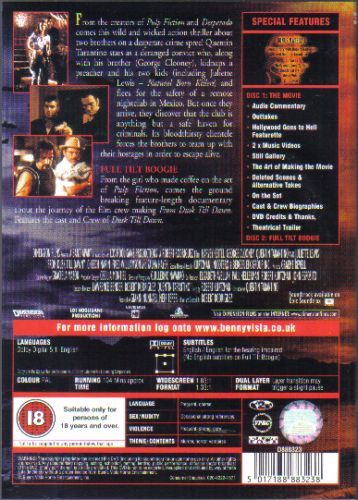 The criminal Gecko brothers Seth (George Clooney) and Richie (Quentin Tarantino) hit the road leaving behind a considerable amount of murders. With the police and FBI on their tails they set course to Mexico. Also on the way is the Fuller family in its motor home: Jacob (Harvey Keitel) and his two children Kate (Juliette Lewis) and Scott (Ernest Liu). The Geckos and the Fullers cross path with the result of the brothers taking the family hostage. Seeking shelter in a bad Mexican bar, they will eventually discover that most of its residents are not exactly what they seem to be.
